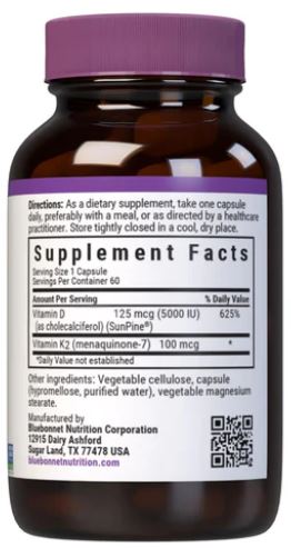 Bluebonnet Kosher Vegan Vitamin D3 125 mcg (5000 IU) & K2 100 mcg Description: