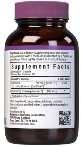 Bluebonnet Kosher Vegan Vitamin D3 50 mcg (2000 IU) & K2 100 mcg Description: