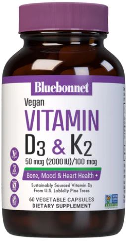 Bluebonnet Vegan Vitamin D3 50 mcg (2000 IU) & K2 100 mcg 60 Capsules