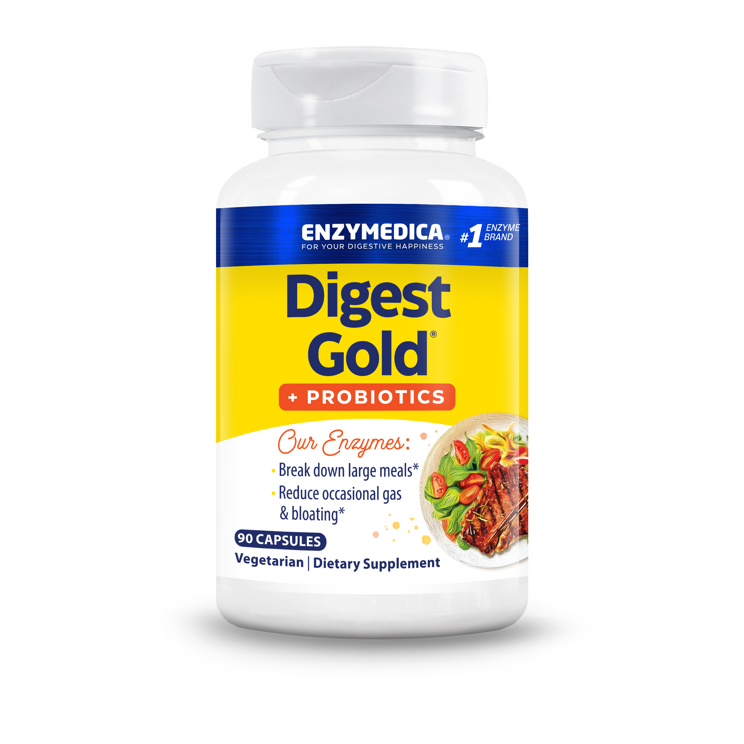 Digest Gold™ +Probiotics contains an advanced enzyme formula that breaks down carbohydrates, fats, fiber and protein.* Probiotics provide additional digestive support by boosting enzyme production and promoting regularity.*