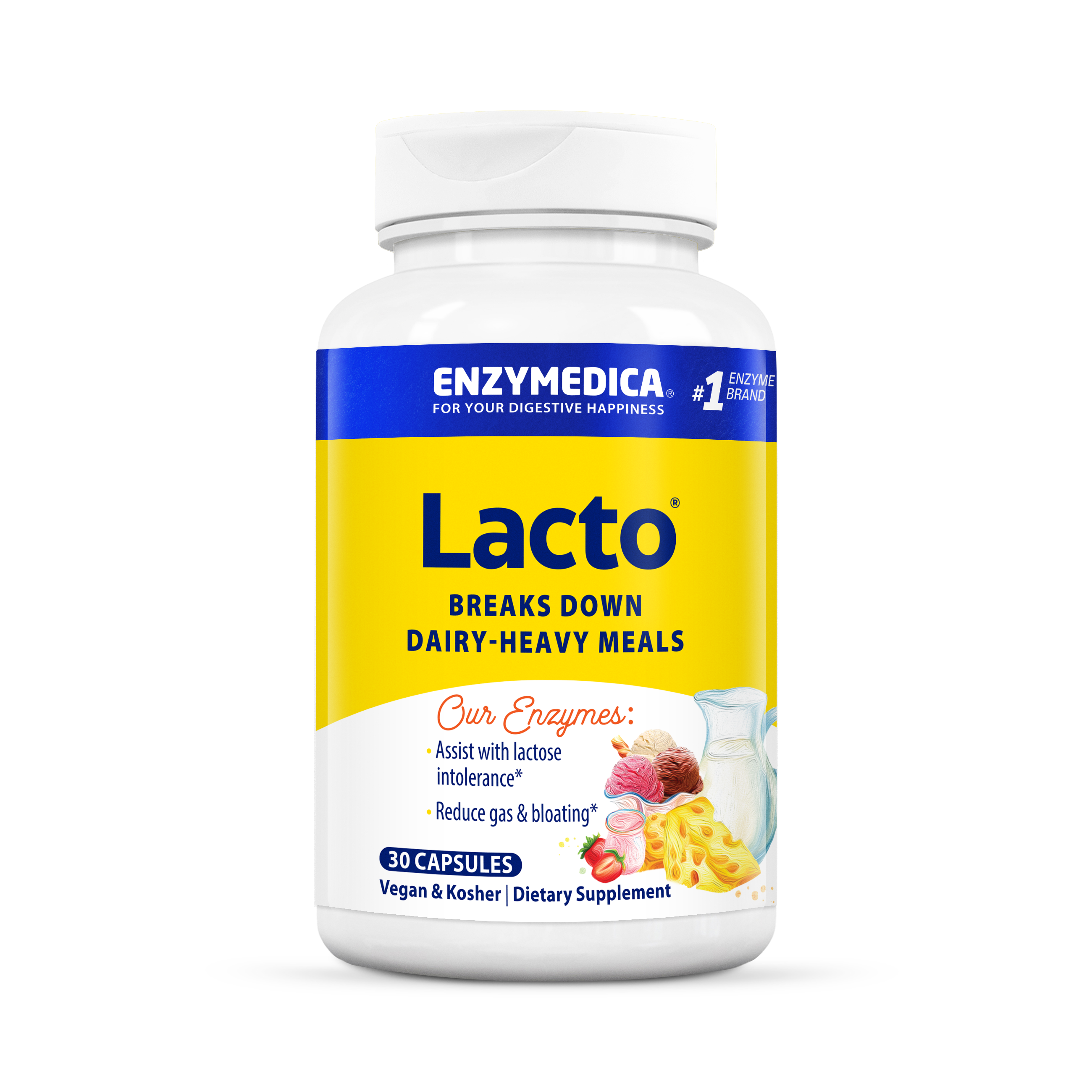 Lacto™ contains lactase and eight other enzymes that work synergistically to digest dairy sugars, proteins and fats. Complete dairy digestion may naturally reduce discomforts which are common to lactose and casein intolerance.*