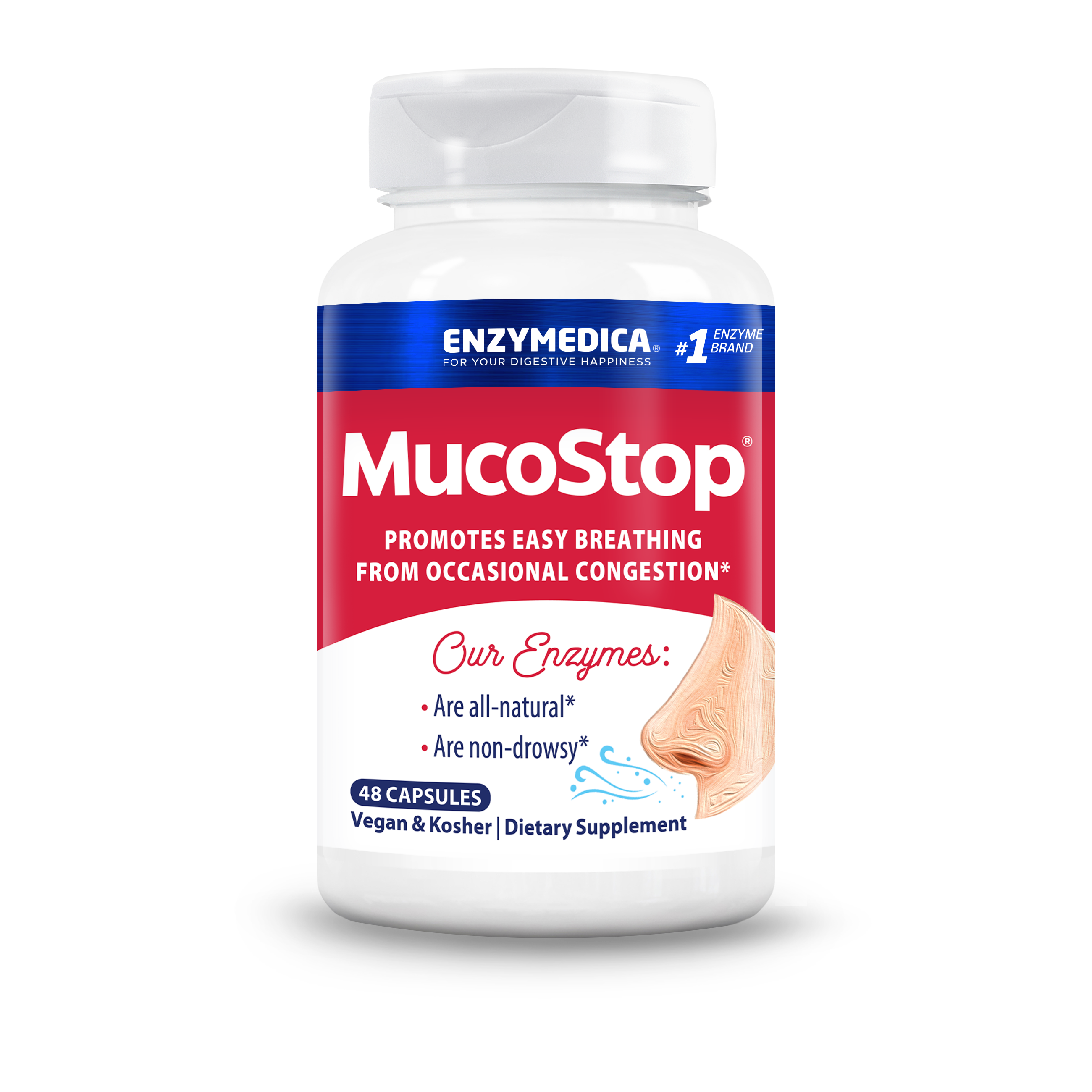 MucoStop™ contains a blend of enzymes specifically formulated to promote easy breathing.* The high-potency enzyme Mucolase™ assists the body’s natural ability to break down and eliminate excess mucus in the sinus and nasal passages.*