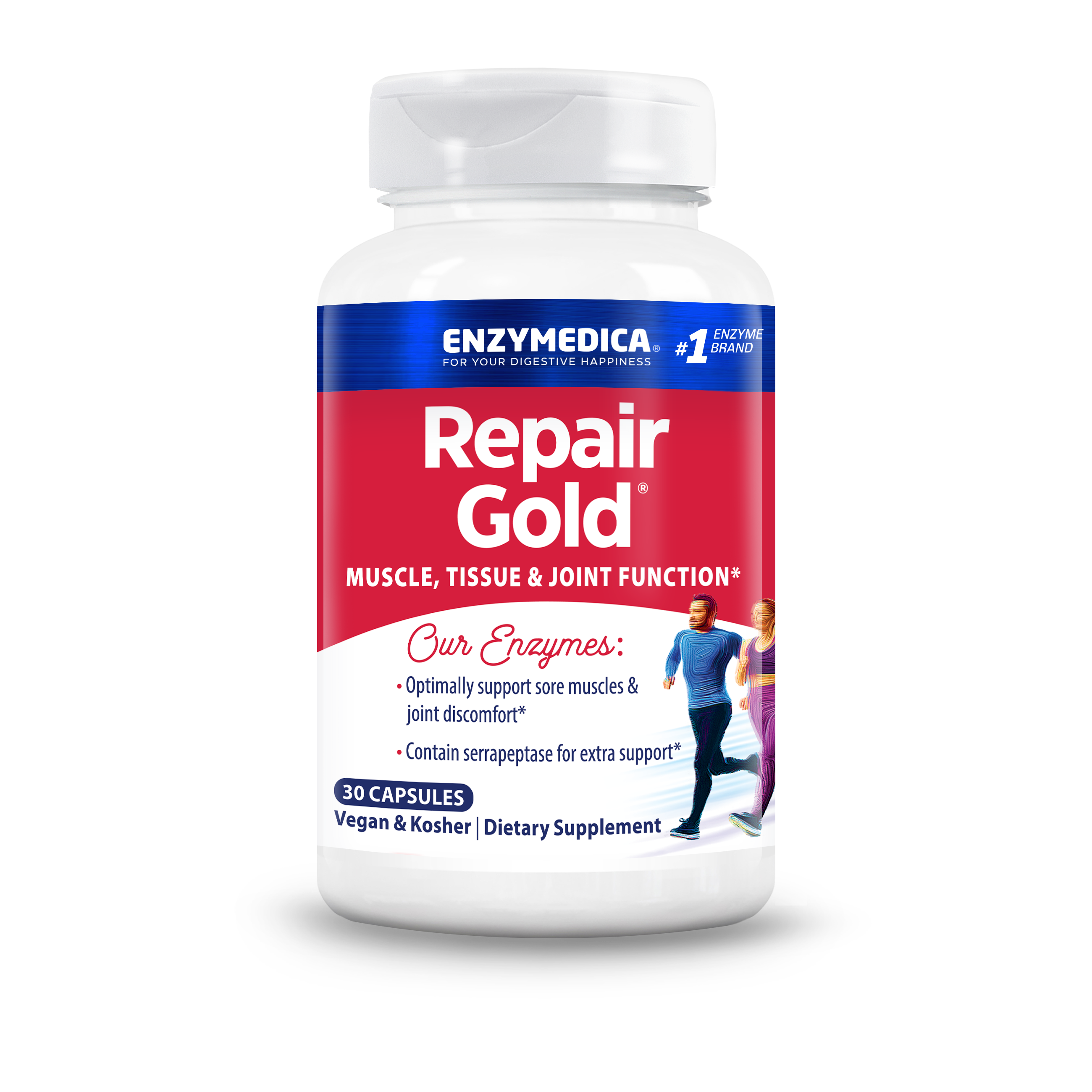 Repair Gold contains Serrapeptase with Bromelain, Papain and additional enzymes known to support fatigued muscles and joints.* The enzymes work synergistically with the body’s own mechanisms of renewal and may support the body’s natural response to overexertion and strenuous activities.* The enzyme blend promotes joint comfort and healthy circulation to encourage accelerated muscle and tissue recovery.*