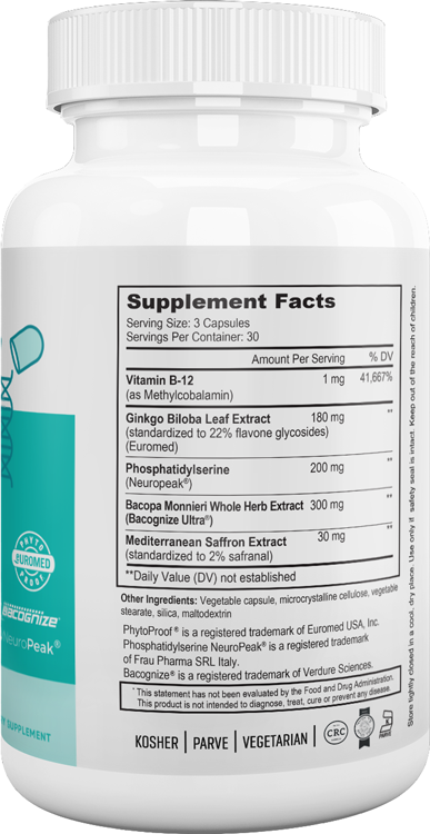 Together with GinkgoPhosphatidylserine (NeuroPeak®), and a balanced B12 dosage, this updated formula delivers a well-rounded, research-backed blend for: