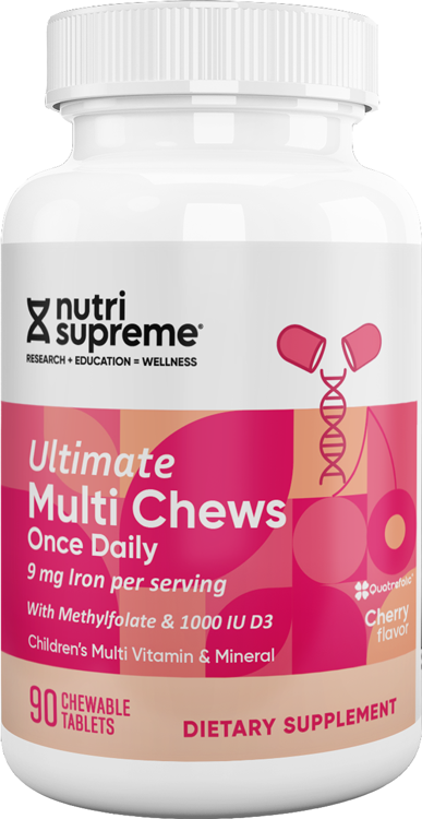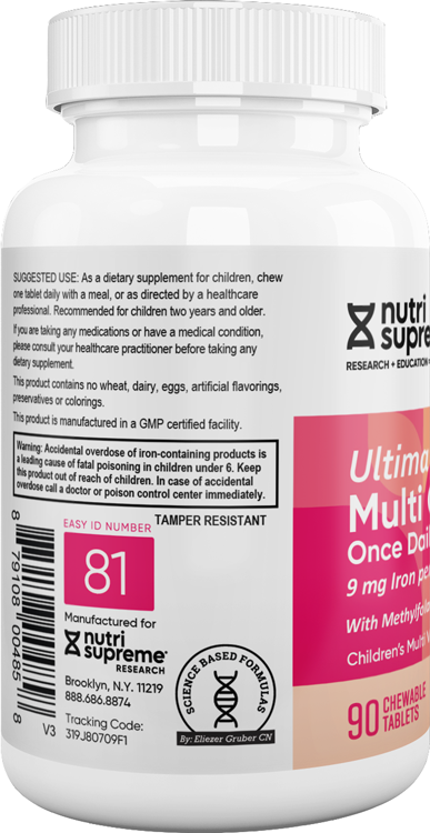 | | Ages 1-3 years of age | Adults and Children 4 years of age and older |  | | Calories | 5 |  | | Total Carbohydrate | 1.5 g | 1* | <1%** |  | | Total Sugars (Includes 1 g added Sugars) | 1 g | 4%* | 2%** |  | | Vitamin A (as beta-carotene) | 750 mcg | 250% | 83% |  | | Vitamin C (as ascorbic acid) | 30 mg | 200% | 33% |  | | Vitamin D [as cholecalciferol (D3)] | 25 mcg (1000 IU) | 167% | 125% |  | | Vitamin E (as d-alpha tocopheryl succinate) | 10 mg | 167% | 67% |  | | Thiamin (as thimain mononitrate) | 1.5 mg | 300% | 125% |  | | Riboflavin | 1.7 mg | 340% | 131% |  | | Niacin 9as niacinamide) | 10 mg | 167% | 63% |  | | Vitamin B6 (as pyridoxine HCI) | 2 mg | 400% | 118% |  | | Folate [from Quatrefolic (6S)-5-methyltetrahydrofolic acid, glucosamine salt] | 833 mcg DFE | 555% | 208% |  | | Vitamin B12 (as methylcobalamin) | 50 mcg | 5,556% | 2,083% |  | | Biotin | 25 mcg | 313% | 83% |  | | Pantothenic Acid 9as D-calcium pantothenate) | 5 mg | 250% | 100% |  | | Calcium (as calciumcarnobate) | 10 mg | <2% | <1% |  | | Iron (as iron glycinate) | 9 mg | 129% | 50% |  | | Iodine (as potassoum iodide) | 50 mcg | 56% | 33% |  | | Magnesium (as magnesium oxide) | 5 mg | 6% | 1% |  | | Zinc (as zinc citrate) | 7.5 mg | 250% | 68% |  | | Selenium (as selenomethionine) | 2.5 mcg | 13% | 5% |  | | Copper (as copper citrate) | 0.05 mg | 17% | 6% |  | | Manganese (as manganese sulfate) | 0.25 mg | 21% | 11% |  | | Chromium (as chromium polynicotinate) | 2.5 mcg | 23% | 7% |  | |  | | Choline bitartrate | 10 mcg | *** | *** |  | | Inositol | 10 mcg | *** | *** |  | |