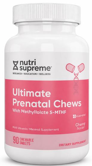 | 250% | 333% |  | | Vitamin E (as d-alpha-tocopheryl succinate) | 20 mg | 133% | 105% |  | | Thiamin (as thiamin mononitrate) | 3 mg | 250% | 214% |  | | Riboflavin | 3.4 mg | 262% | 213% |  | | Niacin (as niacinamide) | 20 mg | 125% | 111% |  | | Vitamin B6 (as pyridoxine HCI) | 4 mg | 235% | 200% |  | | Folate [as (6S)-5-methyltetrahydrofolic acid, glucosamine salt (Quatrefolica)] | 1667 mcg DFE | 417% | 278% |  | | Vitamin B12 (as methylcobalamin) | 100 mcg | 4167% | 3571% |  | | Biotin | 50 mcg