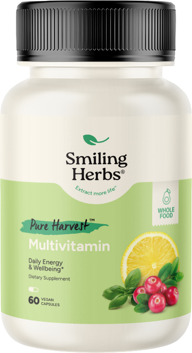 | Vitamin A (as Beta Carotene from food belnd) | 900 mcg REA | 100% |  | | Vitamin C (from food blend) | 90 mg | 100% |  | | Vitamin D3 (from food belnd) | (1000 IU) 25 mcg | 125% |  | | Vitamin E (from food blend) | 15 mg | 100% |  | | Thiamine (B1) (from food blend) | 3.3 mg | 275% |  | | Riboflavin (B2) (from food blend) | 3 mg | 230% |  | | Niacin (B3) (from food blend) | 5.1 mg | 31% |  | | Vitamin B6 (from food blend) | 3.3 mg | 194% |  | | Folate (as food folate, 5-Methyltetrahydrofolate from food blend) | 666 mcg DFE | 166% |  | | Vitamin B12 (from food blend) | 2.4 mcg | 100% |  | | Pantothenic Acid (from food blend) | 5.7 mg | 114% |  | | Biotin (from food blend) | 30 mcg | 100% |  | | Iodine (from food blend) | 150 mcg | 100% |  | | Zinc (from food blend) | 11 mg | 100% |  | | Chromium (from food blend) | 35 mcg | 100% |  | | Selenium (from food blend) | 55 mcg | 100% |  | | Calcium (from food blend) | 28 mg | 2% |  | | Magnesium (from food blend) | 1.9 mg | <1% |  | | Trace Minerals Complex (includes Strontium, manganese, Boron, Silica, Vanadium, Copper, Molybdenum from food blend) | 50 mg | * |  | |  | Pure Harvest Proprietary Blend: Guaca leaf extract, camu camu berry extract, asparagus extract, guava fruit extract, holy basil leaf extract, lemon extract, red marine algae extract, sunflower seed extract, annatto seed extract, kelp extract, mustard seed extract, pine tree extract, parsley leaf extract, curry leaf extract, agati (sesbania) extract, mushroom (shiitake) extract | 1000 mg | * |