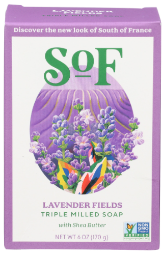 South of France Lavender Fields Oval Soap combines natural glycerin with organic shea butter to leave your skin soft and deeply moisturized. Our all-vegetable soap is triple-milled in the Marseille tradition for a pampering, cleansing experience. Coconut oil and sustainable palm oil create a creamy, luxurious lather while the soothing scent of lavender relaxes mind and body. Our oval soap is free of parabens, phthalates, and sulfates, and is a cruelty-free product containing no animal by-products. Includes one 6 oz. bar of gluten-free South of France Lavender Fields Oval Soap.