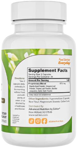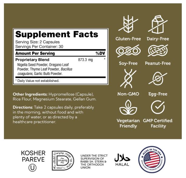 The initial release of Black Seed Oil, Oregano, Garlic and Thyme essential oil are complemented by a delayed targeted release of beneficial probiotic organisms to support microbial balance.